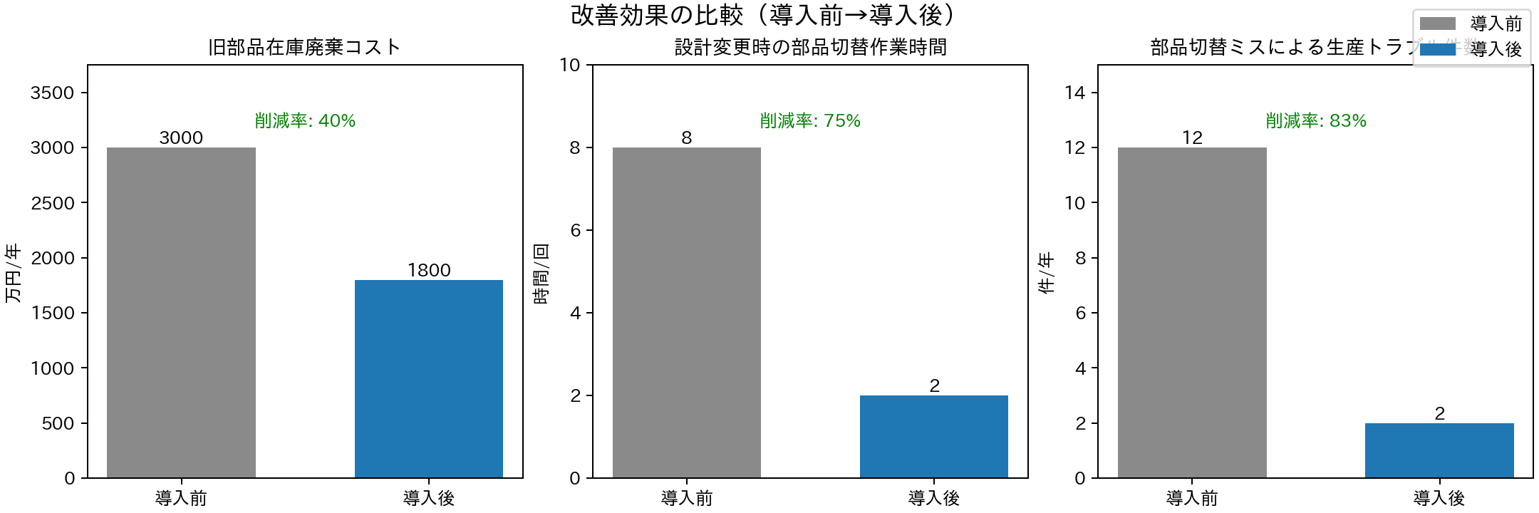 設計変更時の部品切替作業時間:1回あたり8時間 → 2時間(75%削減)